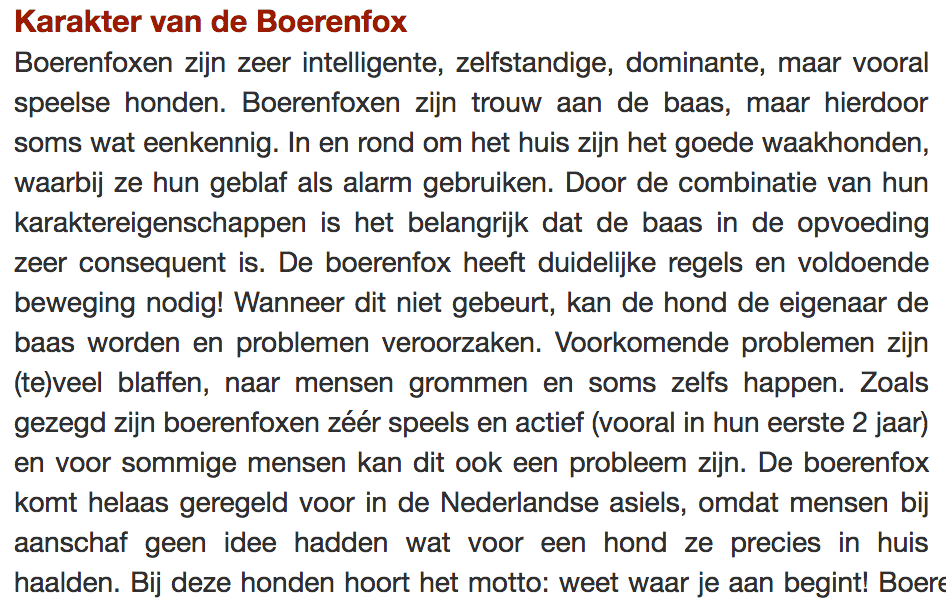 We kozen voor Lupa omdat we Pico, de akita/keeshond, zo een lieverd vinden. Ook hij heeft zijn streken, maar dat vergeet je op het moment dat hij zich tegen je aan vlijt met zijn dikke kroelvacht. Daarbij blijken er geruchten te gaan dat pups over het algemeen meer op hun moeder lijken dan op hun vader. Dat is niet wetenschappelijk onderbouwt, maar in de praktijk lijkt mama toch wel over de sterkere genen te beschikken. Wisten wij veel! Even een korte beschrijving van de boerenfox.